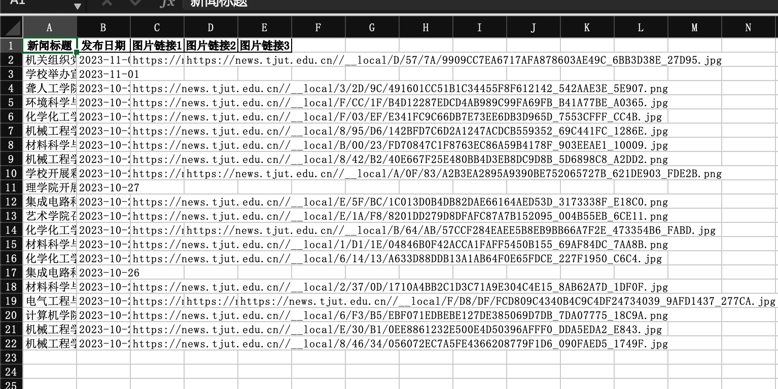 程序将爬取 https://news.tjut.edu.cn/yw1.htm 上每条新闻的 标题、发布日期、每张图片链接 并保存到 news.xlsx