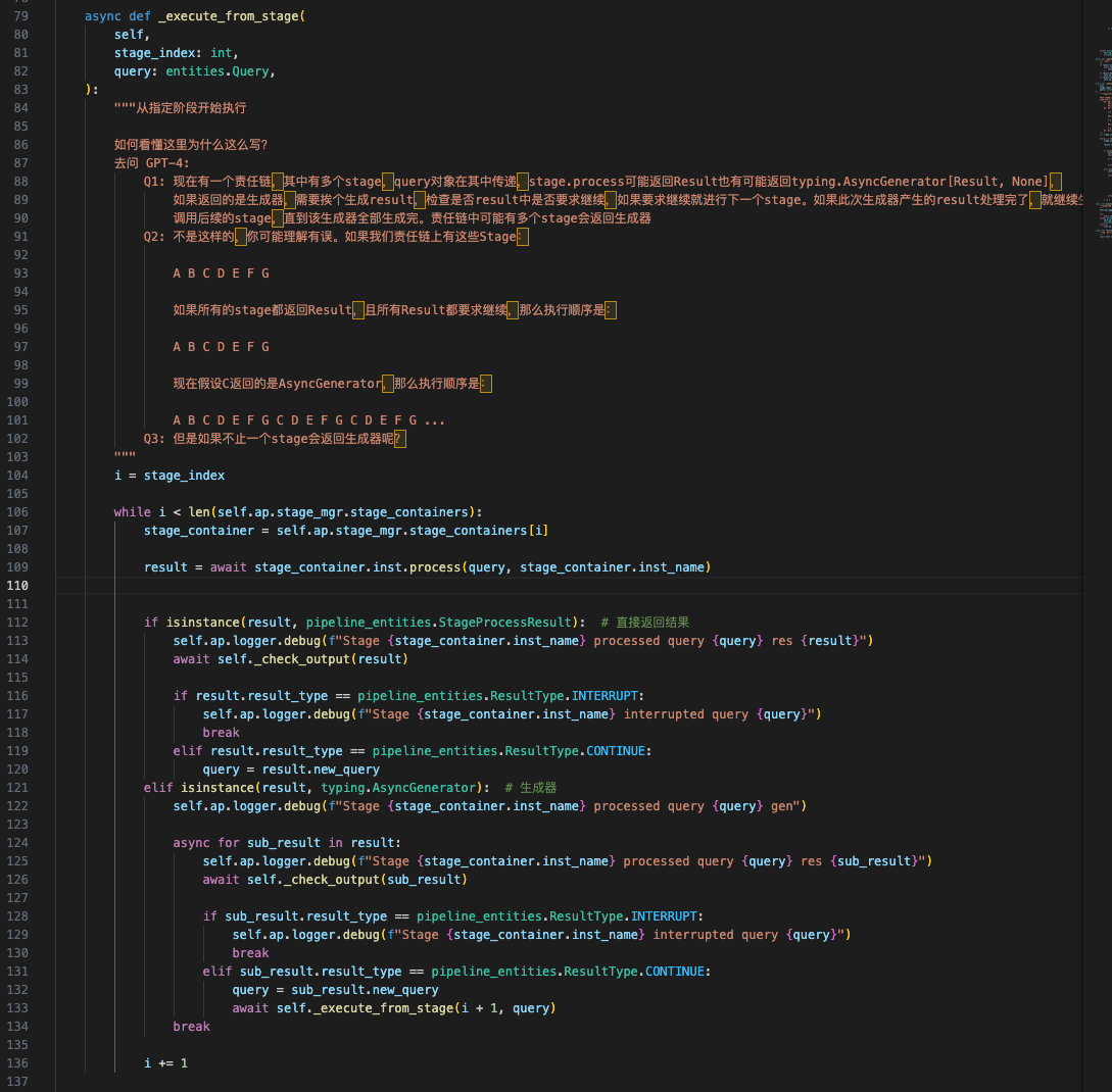 这是本次更新中最划时代的一个特性,之前处理一个请求时,QChatGPT 逐层调用,最后由 qqbot 中的代码发回消息,且只能发送一条消息。由于处理过程中步骤的增加,重构前的代码已经臃肿不堪,层级复杂。