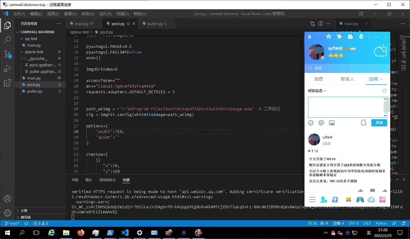 当时运行在一台 Windows 服务器上,一个端用来作为微信小程序(用户端)的后端,接收稿件,与数据库交互;一个端基于 Mirai 和 YiriMirai 实现 QQ 机器人供用户绑定账号;一个端通过 Python 的模拟键鼠操作发表稿件到 QQ 空间(感谢天翼云主机的 web 桌面能在退出后保持亮屏)。这个架构跑了大概 4 个月吧。
