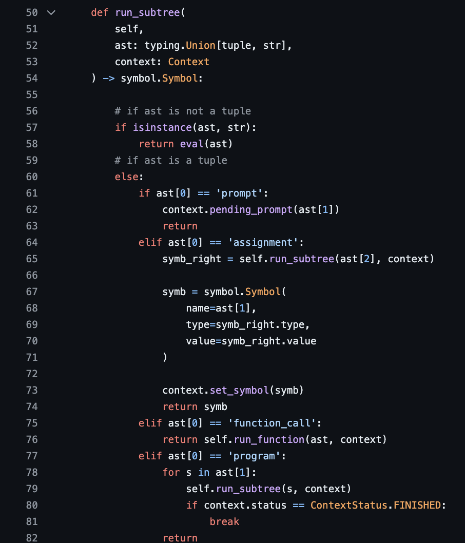 当然直接解释执行。用 PLY 做的 Lexer 和 Parser,由 runtime 的一个 递归函数 解释执行代码,使用一个 Context 类存储 符号表、解释器状态、返回值 等信息。