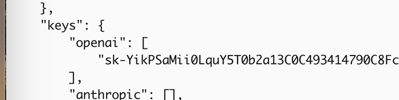 接着把你刚刚的密钥填写到 keys 的 openai 组中: