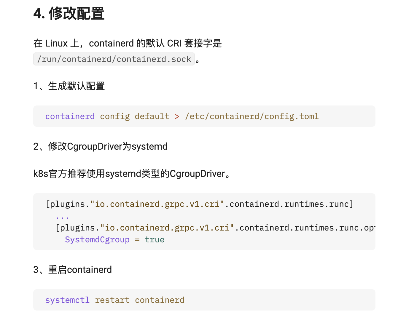 这里很关键的一点,就是最后一定要把 containerd 的 Cgroup 改成 systemd,具体方法就是在配置里把 SystemdCgroup 设为 true。不然后续是没法 init 的。