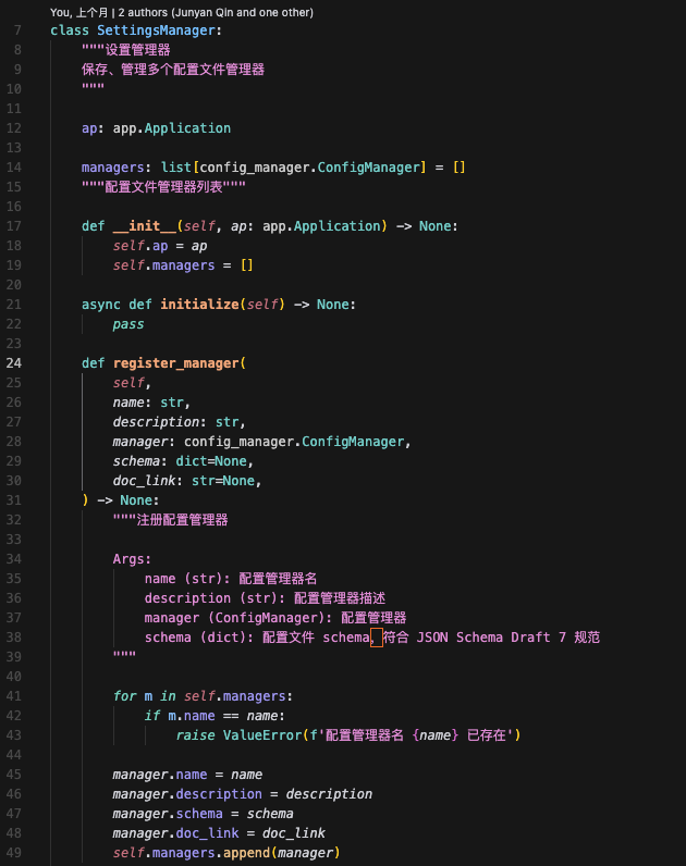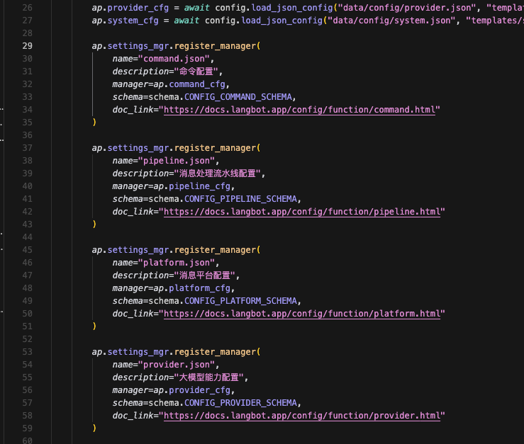 每个配置管理器现在也能存储 配置文件名、描述、对应JSON Schema、文档链接。需要在WebUI的配置管理页面显示的配置管理器,可以调用 ap 中这个 SettingsManager 的注册方法,LangBot 将在启动阶段注册每个配置文件管理器: