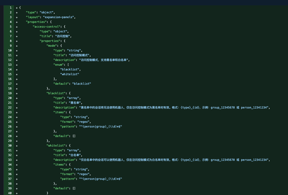 看 AstrBot 的方案是自己写的渲染器 ,创造了一种新的格式。这种实现方式较为简单、直观,但我不想再耗费精力自己造轮子了,况且前期调研也发现了阿里的 formily 之类的成品框架可以直接拿来用,而且 JSON 已经可以用 JSON Schema 来描述,相关的轮子也蛮多,对于扩展性的要求能很好地满足。