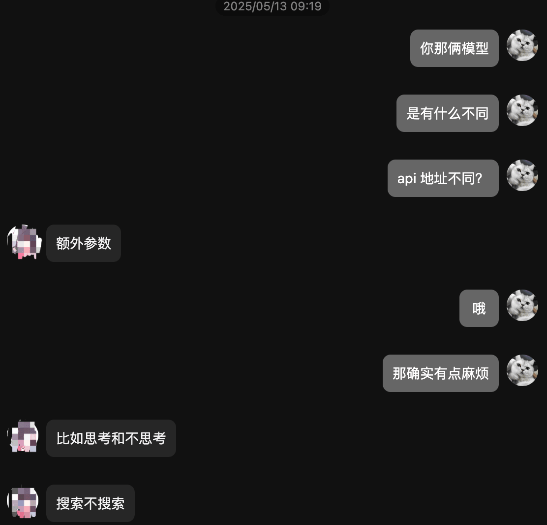我一开始以为是因为不同的模型采用了不同的 base-url ,因为我在开发过程中就使用了不同来源的模型。但我还是决定问一下 ta 具体是什么区别,最终才知道原来是额外参数不同: